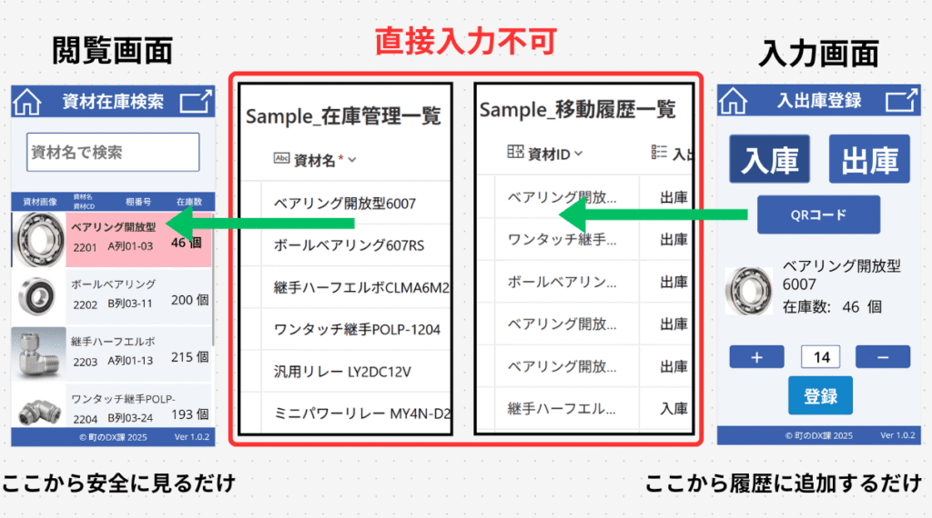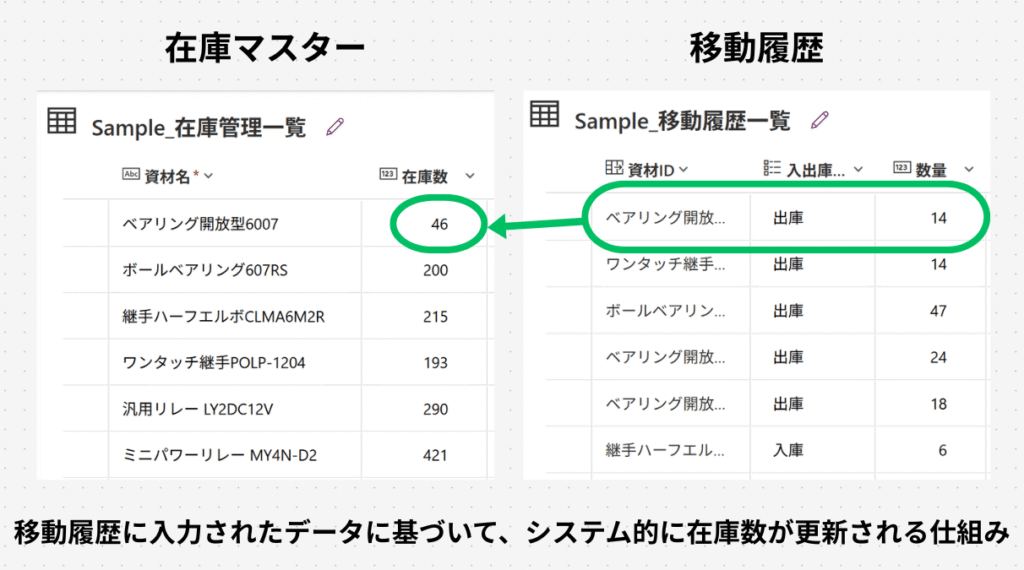 • 目的1:最大の目的は在庫マスターを人間の手入力から守るためです。 日々の在庫変動を「移動履歴」に入力することで初めて、「在庫マスター」の数字は移動履歴からシステムが機械的に更新するという、最も安全な運用が可能になります。